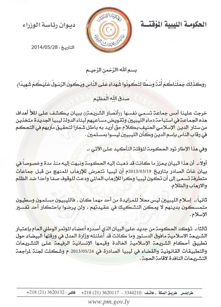Government statement on Ansar al-Sharia. Issued on 28 May.